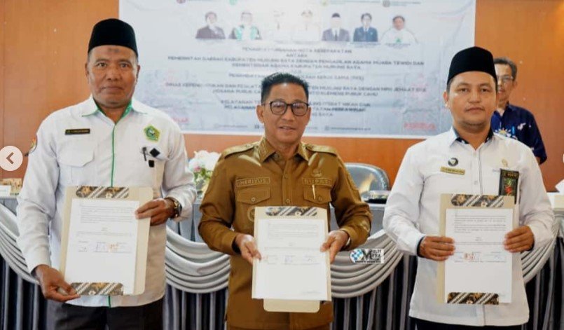 Puruk Cahu, Radar Tribun — Di Aula Cahai Ondhui Tingang, Gedung B Kantor Bupati Murung Raya, Senin (27/10/2025), Pemerintah Kabupaten (Pemkab) Murung Raya (Mura) melaksanakan penandatanganan Nota Kesepakatan dengan Pengadilan Agama Muara Teweh dan Kantor Kementerian Agama (Kemenag) Mura tentang Pelayanan Terpadu Sidang Keliling Isbat Nikah, serta Perjanjian Kerjasama antara Dinas Kependudukan dan Pencatatan Sipil (Disdukcapil) Kab. Mura dengan MPH Jemaat GKE Hosana Puruk Cahu dan Paroki Santo Klemens Puruk Cahu tentang Pelayanan Terintegrasi Pencatatan Perkawinan.